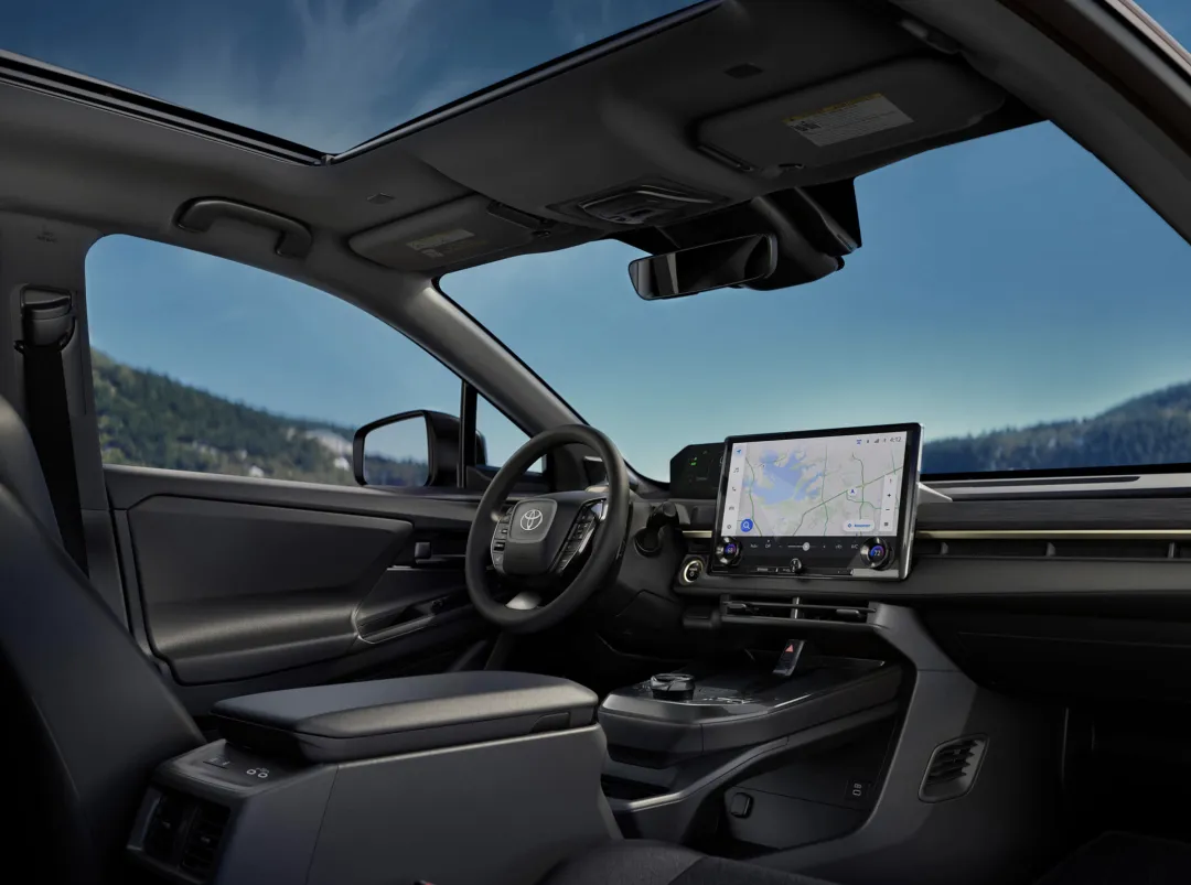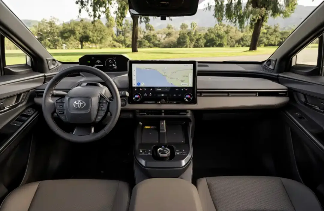 来到车内,丰田bZ Woodland也采用了更加简约的设计布局,采用了大面积棕色软性材质铺陈,还加入了黑色超纤皮材质的交替混搭,还加入了黑色哑光材质的饰板,还有大量银色金属按键的加持,通过不同材质和不同颜色的装饰搭配,凸显出丰富的层次感。前排配备了类似赛车桶装座椅设计,加宽加厚的侧翼提供了更好的包裹和支撑,还带有加热、通风功能。中控台配备了悬浮式的远端全液晶仪表盘,并搭配三辐式多功能方向盘,中控台中间配备了14英寸的多媒体触控屏,并集成了空调控制面板。操控岛更加简约,配备手机无线充电面板、旋钮式的电子换挡机构以及大颗粒物理按键。