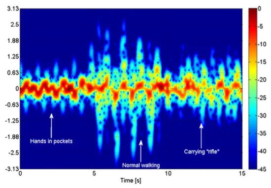 图3 Spectogram analysis of persons walking hands in pocket, normal walking and carrying rifle