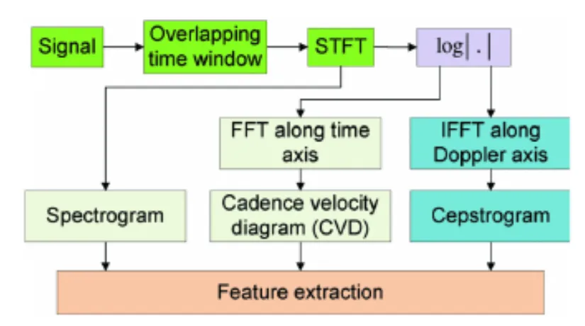 1 适用于range-Doppler-Angle架构,由于速度分辨率提高,range-Doppler map中已经呈现出目标相应的微多普勒信息,也就是多普勒扩展,那么可以在信号处理层面单独基于这些扩展定义特征,适用于detection相对比较少的情况。
