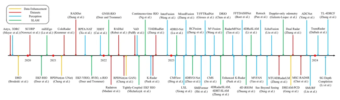 图16 The timeline of 4D mmWave radar-related works, including learning-based radar data generation methods, perception and SLAM algorithms, and datasets