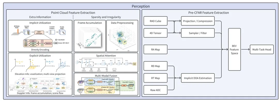 对于Pre-CFAR数据使用的研究,主要有两个方向。一种是利用FFT解析过后的RAD数据。由于4D成像雷达的数据量巨大,所以RAD数据需要进行稀疏化处理。这个操作可是用人工定义的筛选规则(CFAR也是其中一种),更好一点是用机器学习和数据驱动的方式来自动进行。另外一种是直接输入ADC原始数据,用神经网络来模拟FFT的解析操作,并且与下游任务一起进行端对端训练。在这种方法中,同样的,也需要考虑数据里的问题。在神经网络解析完之后,或者在解析的过程中,数据需要进行一定程度的稀疏化。