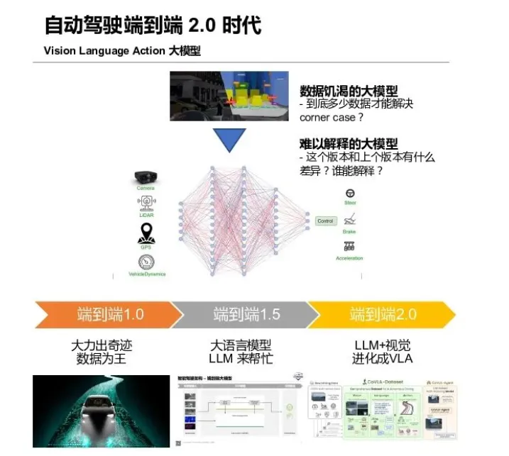 像海鲜市场一样,智能驾驶行业技术浪潮正在快速更迭。“端到端”刚成为新的技术范式,甚至大量公司还没来得及完成研发模式切换,端到端就进入了技术换代时期。 “端到端”的最新进化方向是,深度融入多模态大模型。 过去两年,大模型已经展现出了读文、识图、拍电影的能力,但大模型开车恐怕还是头一遭。 近期, 智驾端到端领域出现了一个融合了视觉、语言和动作的多模态大模型范式——VLA(Vision-Language-Action Model,即视觉-语言-动作模型),拥有更好的场景推理能力与泛化能力。不少智驾人士都将VLA视为当下“端到端”方案的2.0版本。 事实上,VLA模型最早见于机器人行业 。2023年7月28日,谷歌DeepMind推出了全球首个控制机器人的视觉语言动作(VLA)模型 RT-2。 目前这个模型概念正快速扩散到智驾领域。今年10月底,谷歌旗下自动驾驶公司Waymo推出了一个基于端到端的自动驾驶多模态模型EMMA。有行业人士表示,这就是一个VLA模型架构,既有端到端智驾能力,还融合了多模态大模型。 过去,智能驾驶行业基于规则算法,进行了十数年探索。近两年,特斯拉引领的“端到端”智能驾驶,成为新的技术方向,不仅让智驾具备更拟人的表现,也能应对城市中海量的复杂交通场景。 配合“端到端”技术,行业玩家还会增加大语言模型等来提升智驾能力上限。比如端到端+VLM(视觉语言模型),就被理想等公司推崇。 不过,VLM模型着重于图像和场景的理解,作为智驾决策规划输入,让车辆行为更合理 ;而VLA模型 ,会将端到端与多模态大模型结合得更彻底, 能够根据感知直接生成车辆的运动规划和决策。 某种程度上看,VLA模型比VLM更加接近“图像输入、控制输出”的端到端智驾理想状态。特斯拉没有公开过端到端的技术路线,但行业用多模态大模型,有机会实现类似效果。 可以说,VLA是“端到端+VLM”技术框架的“终结者”。就连理想人士也向36氪汽车坦承,“可以把VLA看成是端到端+VLM的合体。” 有行业人士表示,VLA模型对智驾的演进意义重大,在L2辅助驾驶到L4自动驾驶的飞跃中,VLA可能会成为关键跳板;另一方面, VLA模型也可能成为智能驾驶走向更广阔的具身智能行业的连接点。 一些车企智驾玩家已经在暗自发力。此前,理想汽车曾在三季度财报电话会议上表示,内部已经启动了L4级别自动驾驶的预研,在当前的技术路线基础上,研发能力更强的车端VLA模型与云端世界模型相结合的强化学习体系。 智驾公司元戎启行在获得长城汽车的7亿元注资之后,也表示将进一步布局VLA模型。元戎启行称,公司将基于英伟达最新智驾芯片Thor进行VLA模型研发,模型预计于2025年推出。 但也存有共识,VLA模型的上车难度不小,对技术和车端的芯片算力都有高强度要求,“能够支持VLA模型上车交付的芯片,可能在2026年才会出现。” 自2023年以来智驾行业掀起的BEV、端到端技术浪潮后,智驾正逐步将AI神经网络融入感知、规划、控制等环节。比起传统基于规则的方案,基于AI、数据驱动的“端到端”拥有更高能力天花板。 图源:元戎启行 但在“端到端”模型之外,车企们还辅以了大语言模、视觉语言模型等外挂,来提供更强大的环境理解能力。年中,理想就推出了端到端模型+VLM(视觉语言模型)的方案。VLM模型对复杂交通环境具有更强的理解能力,可以给端到端提供相关驾驶建议。 不过理想的端到端模型+VLM模型,是相对独立的两个模型。 有行业人士告诉 36氪汽车, 理想的VLM模型运行需要占用一颗Orin芯片算力,目前主要对限速提醒等场景做出驾驶建议。 而VLA模型,是将端到端、VLM两个模型合二为一。也就是说,多模态大模型不再作为端到端的外挂,而是成为端到端自生的一种能力。 谷歌Waymo近期发表的论文中,端到端自动驾驶多模态模型EMMA,不仅将摄像头的视频和图像作为感知输入,同时还能以谷歌地图“请在前方第二个匝道右转出匝道”这种指令作为输入,以及结合车辆历史状态,输出车辆未来轨迹。 而加入多模态大模型后,EMMA不仅仅是理解图像视觉内容,还能进行运动规划和行为生成,实现从感知到决策再到控制的完整链条。 有行业人士向36氪汽车表示,目前对于一些特殊的复杂场景,智驾仍然缺少学习数据样本。如果融入模态大模型,就能将大模型学习到的知识迁移给智驾系统,可以有效应对corner case(长尾场景)。 智驾公司元戎启行CEO周光也认为,VLA模型是端到端的2.0版本。他表示,遇到一些复杂的交通规则、潮汐车道、长时序推理等特殊场景时,智驾会比过往理解、应对得更好。 比如在推理时长上,传统rule-base(基于规则)方案下,智驾只能推理1秒钟路况信息然后做出决策控制;端到端1.0阶段系统能够推理出未来7秒路况,而VLA能对几十秒路况进行推理。 “目前基本上大家沿着这条线已经预研1年多了,不过明年想要量产还是有很大难度。”有行业人士表示。 在进入规模推广之前,下一代端到端方案还面临很现实的挑战。 一方面,现阶段车端芯片硬件不足以支撑多模态大模型的部署落地。有行业人士向36氪汽车表示,将端到端与VLM模型二合一后,车端模型参数变得更大,既要有高效实时推理能力,同时还要有大模型认识复杂世界并给出建议的能力,对车端芯片硬件有相当高要求。 当下,高阶智驾的算力硬件基本为2颗英伟达OrinX芯片,算力为508Tops。有行业人士表示,现阶段车端的算力很难支撑VLA模型部署。 而英
