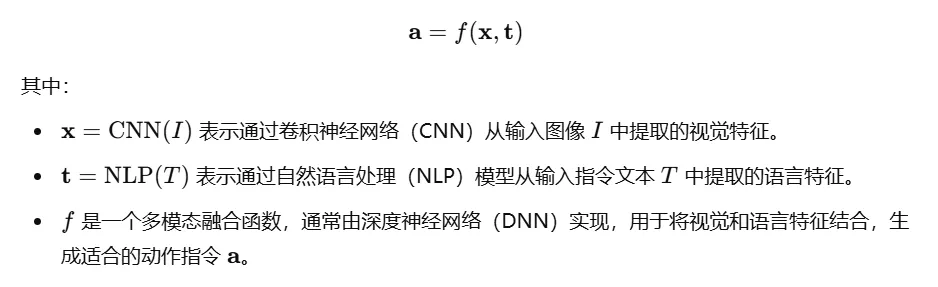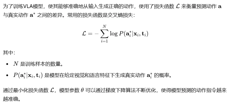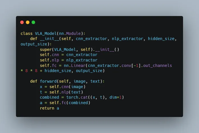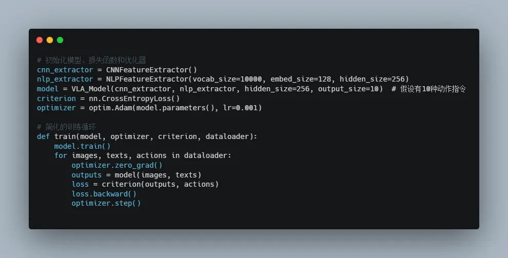 编程实现:从理论到实践 理解了VLA模型的数学基础后,让我们通过一个简化的编程示例,看看如何将视觉和语言特征融合并生成动作指令。这不仅让理论变得具体,还能帮助你更直观地理解VLA模型的工作原理。 VLA模型的简化实现 代码详解:一步步走进VLA模型 让我们逐步拆解这段代码,看看每一部分是如何协同工作的。 这段代码展示了如何将VLA模型从理论转化为实际应用,通过视觉和语言特征的提取与融合,实现从输入到动作的端到端训练。