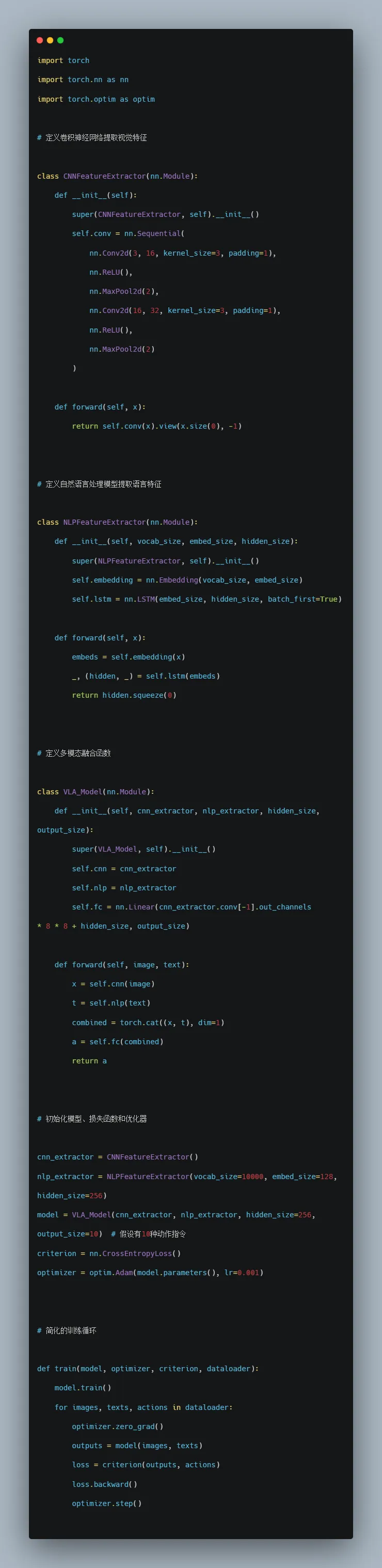 模型实例 :创建CNN特征提取器和NLP特征提取器,并将它们传递给VLA模型。