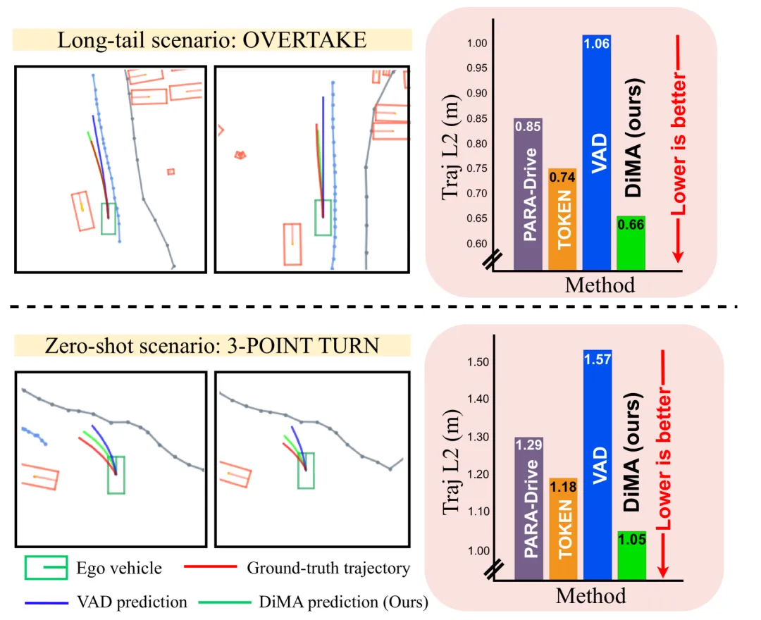 图1:来自nuScenes的长尾场景规划性能比较:在超车和三点掉头等长尾导航场景中,DiMA-VAD相比于VAD 展现了更强的鲁棒性。DiMA-VAD还优于近期的视觉规划器PARA-Drive 和LLM规划器TOKEN 。值得注意的是,三点掉头是一个零样本场景,仅出现在验证集上。