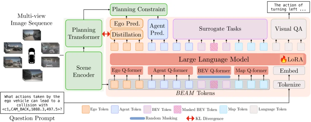 蒸馏任务,并结合以下代理任务,以对齐基于视觉的规划器和MLLM的目标:(i) 掩码标记重建 (ii) 未来标记预测 (iii) 场景编辑。 DiMA优于基于视觉和LLM的端到端规划器,在nuScenes规划基准测试中取得了最先进的结果。使用DiMA进行训练使得基于视觉的规划器的L2轨迹误差减少了37%,碰撞率降低了80%,并且在长尾场景中轨迹误差减少了44%。 自动驾驶 (AD) 系统通常是模块化的,由感知、运动预测 [5, 28, 31] 和规划 [10] 等任务组成。经典的 AD 系统为每个任务使用独立的模型,其中每个模块单独优化并顺序组合。或者,一些方法将这些模块化任务合并到多任务学习范式中,其中任务共享一个公共特征提取过程,但具有特定于任务的头 。最近,研究转向以端到端方式优化自动驾驶系统,旨在直接预测未来轨迹 [22, 18, 6, 4, 8, 51]。沿着这条工作线,UniAD [20] 引入了一种基于查询的设计,将感知和预测组件集成在一起,实现了端到端的规划方案。VAD [22] 利用矢量化场景表示,取代了 [20] 中密集栅格化表示,降低了计算成本并提高了规划性能。虽然在一般导航场景中有效,但这些方法在困难的长尾事件中存在困难(参见图 1)。在这项工作中,我们提出了一种用于端到端自动驾驶的方法,该方法对这些场景具有鲁棒性。 大型语言模型的近期成功证明了它们能够处理具有逻辑推理的复杂上下文信息并以人类可解释的方式进行交流,引起了自动驾驶领域的高度关注。这些工作调查了语言模型泛化到新场景的能力以及它们以文本形式推理场景的能力。 提示LLM。一种方法涉及使用推理框架(例如思维链)提示 LLM。 LanguageMPC 利用 LLM 的常识推理能力做出高级驾驶决策,然后将其转换为底层控制信号。GPT-Driver将观察结果和自我状态转换为语言提示,将驾驶规划框架化为 LLM 的文本任务。 使用 MLLM 进行端到端驾驶。另一种方法是将多模态 LLM 集成到自动驾驶车辆的端到端训练框架中。LMDrive将视觉编码器与大型语言模型集成,从而在自动驾驶中实现自然语言指令。DriveLM 引入了多步问答,超越了单轮交互 。DriveVLM 利用 MLLM 和思维链过程来增强场景理解和规划。 我们指出了当前用于自动驾驶的 MLLM 策略中的一个挑战。建议,为了推理车辆动力学,语言模型受益于显式建模场景组件的结构化输入,而不是像那样对 MLLM 进行密集、无结构的输入。在 TOKEN 中,来自的场景编码器用作标记器。但是,它在训练期间被冻结。在我们的方法中,MLLM 的输入是一组从预训练的场景编码器中学习到的潜在表示,该场景编码器与 MLLM 联合训练,使其能够学习更接地的特征表示。 我们提出了DiMA,一个端到端自动驾驶框架。给定一序列多视角图像,整体目标是预测ego车辆的未来轨迹并回答关于场景的问题。DiMA的框架概览见图2。该框架包含两个主要组件:1)基于视觉的规划器;2)一个多模态大语言模型(MLLM),由适配层、LLM和一系列任务特定的解码头组成。 基于视觉的端到端规划器以多任务方式进行训练,执行感知、地图构建、运动预测和规划等任务。考虑到标准架构设计,我们将规划器分解为场景编码器和规划变换器。场景编码器向规划变换器提供结构化的潜在表示,规划变换器用于执行路径点预测。我们将这些表示称为场景标记嵌入。在我们的框架中,我们以两种方式利用基于视觉的规划器。首先,它作为执行规划的主网络,使得在测试时能够快速预测。其次,场景编码器与MLLM共享,作为标记器为其提供高度结构化的输入。我们框架与先前工作的一个重要区别是,场景编码器与MLLM一起联合训练。 场景编码器将场景建模为高维标记嵌入,明确表示环境地图、ego车辆和周围代理等组件。通过引入任务特定的、可学习的查询特征,并通过一系列规划约束进行监督,实现了这一目标[22]。首先,视觉主干网络对输入的多视角图像序列进行编码。得到的特征图通过一组查询投影到鸟瞰图(BEV)空间,以获得BEV标记嵌入(B)。该网络通过与地图和代理查询的交叉注意机制,学习以地图标记嵌入(M)和代理标记(A)嵌入形式表示的结构化地图和代理特征。一个随机初始化的可学习嵌入被训练以学习ego车辆与代理和地图组件的交互,这就是ego查询(E)。我们将这些潜在场景表示的集合表示为B E A M标记嵌入。这些标记嵌入被传递到规划头中,用于预测ego和代理车辆的未来轨迹。同时,它们也作为多模态输入传递给MLLM,如下所述。 我们的目标是将MLLM的知识蒸馏到基于视觉的规划器中。为此,我们将基于视觉的规划器与MLLM联合训练。具体来说,场景编码器作为可训练的标记器用于MLLM,以生成B E A M标记嵌入,并作为规划变换器的编码器。该策略的优势有两个方面。首先,MLLM接收高度结构化的输入,捕捉与自动驾驶任务相关的丰富时空信息。其次,场景编码器学习到的特征与语言对接,从而提高了基于视觉的规划的鲁棒性。MLLM的主要组件包括适配层、大语言模型和一系列任务特定的解码头,接下来我们将详细讨论。 为了高效地投影B E A M标记嵌入,同时保持其独特性,我们利用查询变换器(Q-former)模块[19]在输入到LLM之前对视觉标记进行压缩。我们实现了组件特定的Q-former层,即地图Q-former、鸟瞰图(BEV)Q-former、ego Q-former和代理Q-former。每个适配器将表示不同模态的标记转换为固定长度的高维标记序列,准备将其输入到MLLM进行处理。 我们为MLLM设计了任务,目标是:a)丰