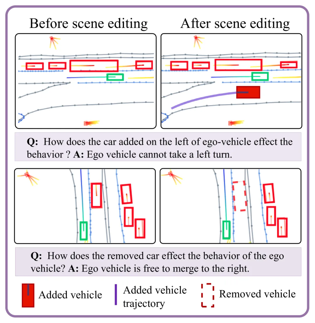 场景编辑: 为了预测和推理自车的行为,学习周围代理如何影响自车的未来路径至关重要。我们提出了一种新颖的场景编辑任务,通过移除或添加新代理来增强场景。并且,我们构建了与编辑相关的问题-答案对。图 3 展示了这一过程的示例。对于场景添加,给定地图约束、预测的地图、自车边界框位置和预测代理的轨迹,我们为新的“汽车”或“卡车”类别的代理创建一个航点轨迹。然后,通过一个线性层创建一个新的代理令牌嵌入。这个新的代理令牌嵌入、相应的文本提示以及其余的 BEAM 令牌嵌入将作为输入传递给 LLM。对应于代理令牌嵌入的隐藏潜在 LLM 特征随后会被送入专门的场景编辑解码头,该解码头执行自车的航点预测。语言预测头则对新的 QA 对进行问答。这一任务因此贡献于现有的规划约束损失和 MLLM 的 VQA 损失。 蒸馏: 为了进一步对齐视觉规划器和 MLLM 学习到的表示,我们在语言模型的倒数第二层和规划转换器之间执行知识迁移。具体来说,我们最小化规划转换器的隐藏特征分布与自车令牌嵌入的 LLM 隐藏特征之间的 KL 散度。 其中 Pvis 是视觉规划 Transformer 倒数第二层的特征,而 Pllm 是对应于 MLLM 模型倒数第二层的自车令牌嵌入的隐藏 LLM 嵌入特征。