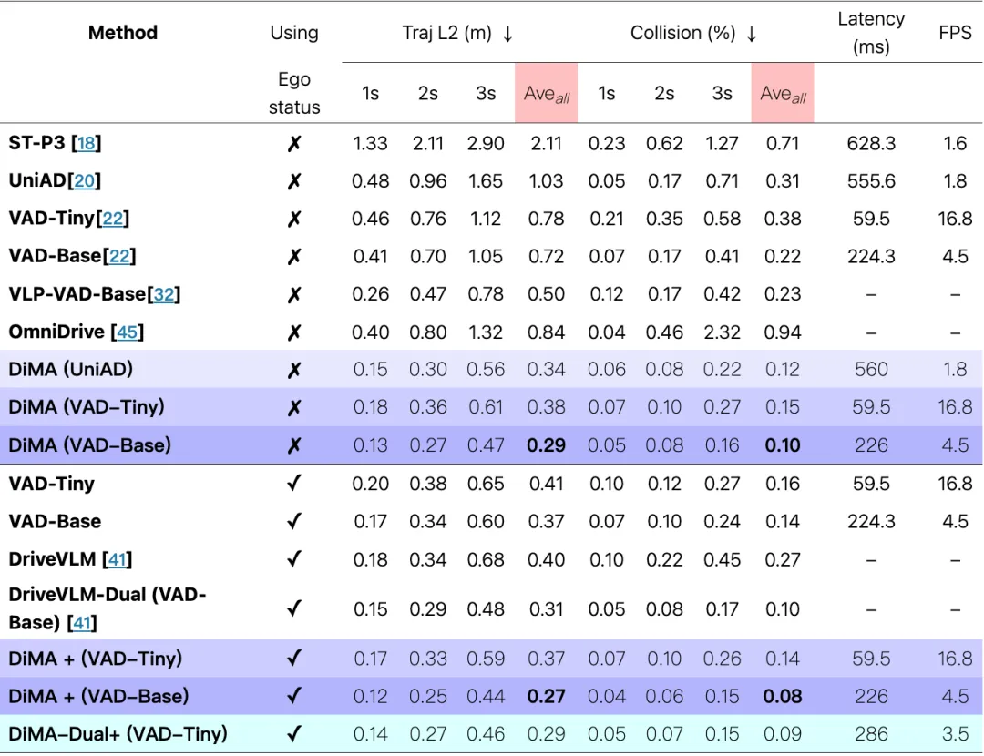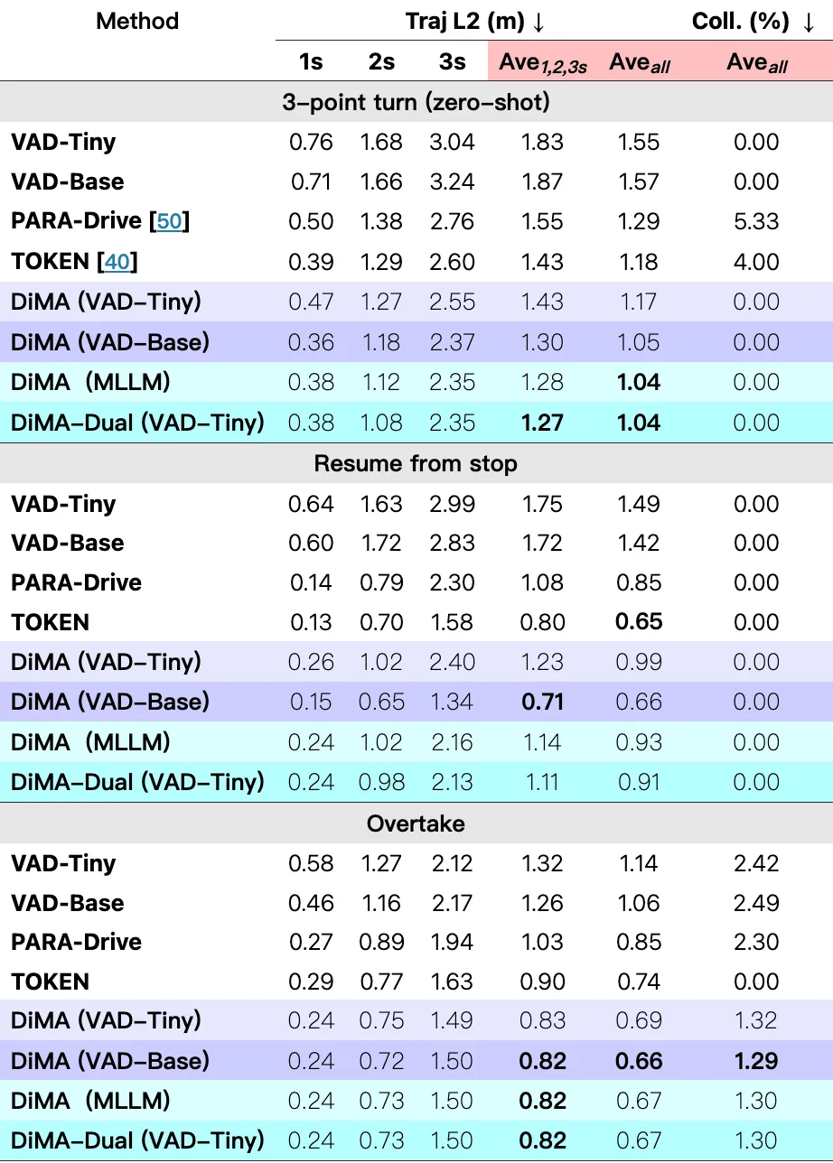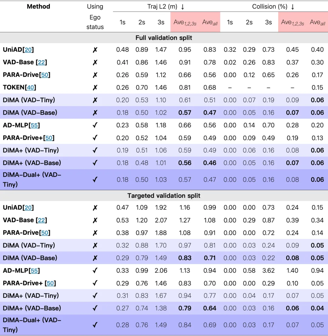 表 3:使用标准化评估对 nuScenes验证集上的 L2 轨迹误差和碰撞率进行的长尾性能比较。视觉规划器 DiMA 模型变体的表现以紫色阴影表示,MLLM 分支的 DiMA 模型变体的表现以蓝色阴影表示。我们通过在 t = {1, 2, 3} 秒和所有时间步长上的平均值来总结结果。在每个设置中,最佳的平均性能以粗体显示。