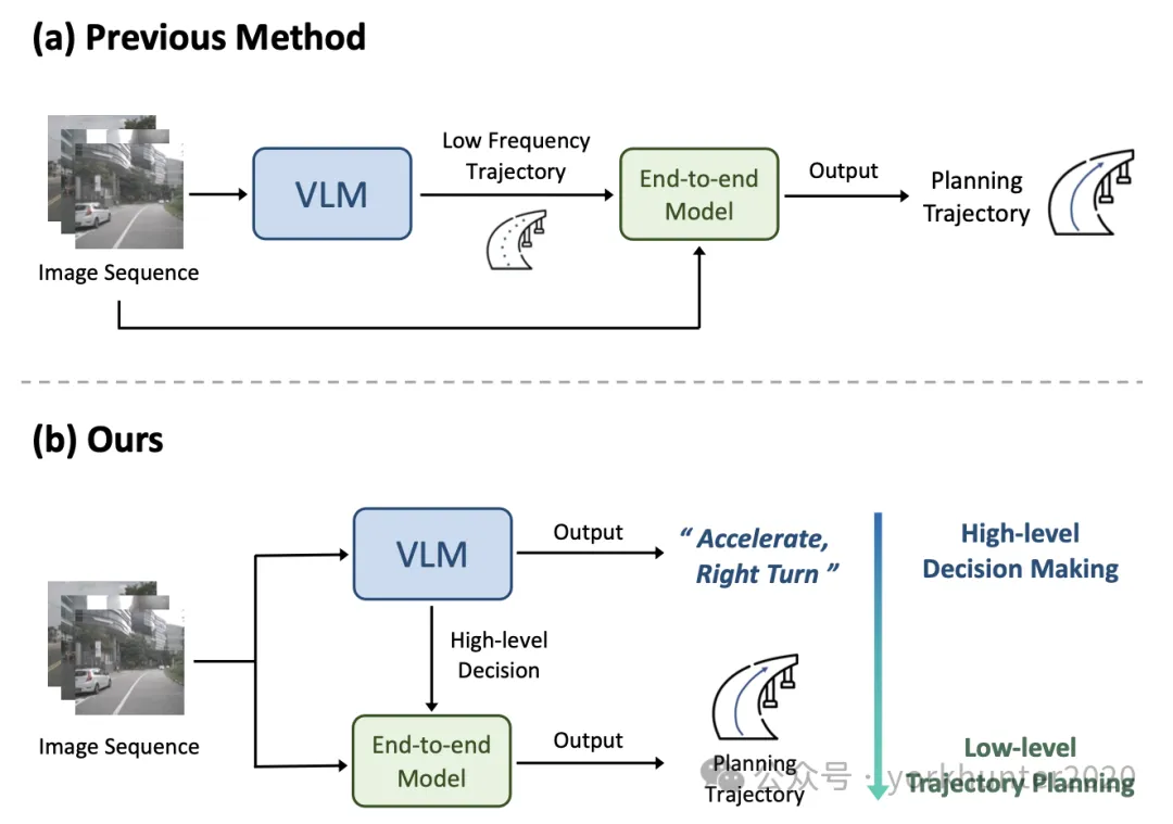 端到端自动驾驶的常见做法是直接预测未来轨迹或控制信号,而无需决策步骤。然而,这种方法可能会使模型学习更加困难,同时缺乏可解释性。相比之下,当人脑做出详细决策时,由分层高级决策和低级执行组成的系统起着至关重要的作用 [18]–[20]。此外,端到端模型通常缺乏常识,在简单场景中可能会出错。例如,它们可能会将载有交通锥的卡车误认为是路障,从而触发不必要的刹车。这些限制阻碍了端到端模型的规划性能。