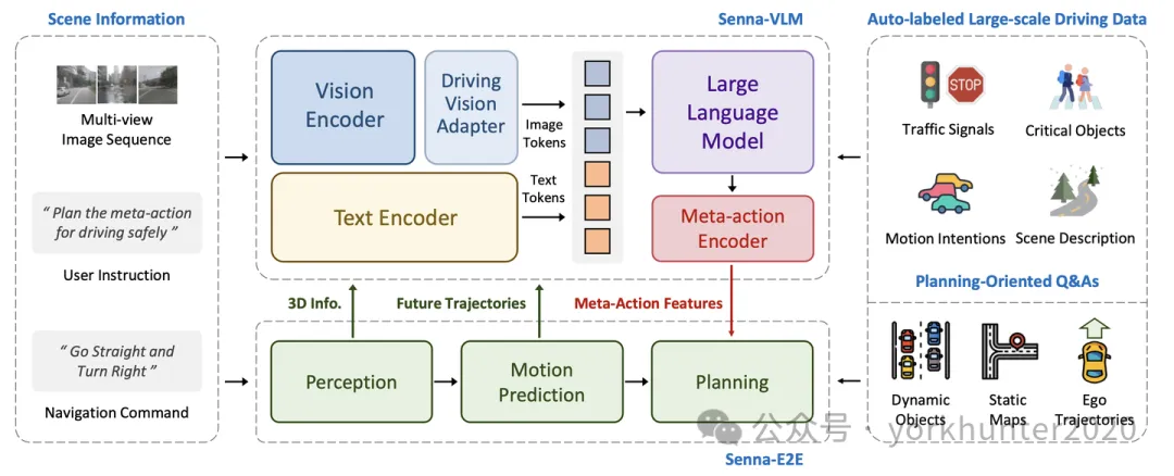 如图所示:Senna 是一个结构化的自动驾驶系统,由大型视觉-语言模型 (Senna-VLM) 和端到端驾驶模型 (Senna-E2E) 组成。Senna-VLM 以自然语言生成高级规划元动作,而 Senna-E2E 则预测低级规划轨迹。设计一系列面向规划的 QA,这些 QA 可以大规模自动标记,并采用三步训练策略,实现对驾驶场景的深刻理解和准确规划。