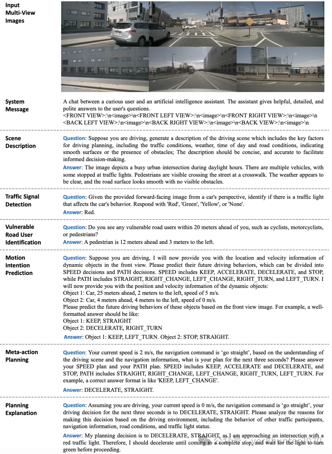 弱势道路使用者识别 。通过识别环境中的弱势道路使用者 (VRU),增强 Senna 对这些关键目标的感知并提高了规划的安全性。具体而言,用真值 3D 检测结果来获取 VRU 的类别和位置,然后以文本形式描述此信息。位置信息以自车为中心,包括每个 VRU 相对于自车的横向和纵向距离。仅使用 Senna-VLM 来预测距离的整数部分,以在构建距离感知的同时降低学习复杂性。