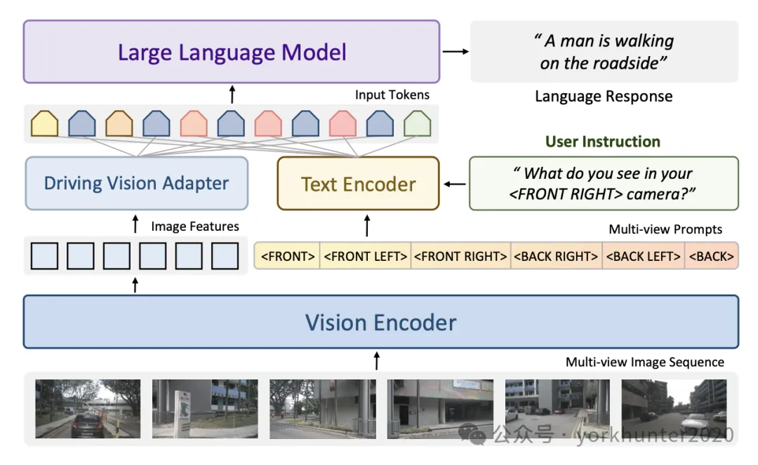 用CLIP [51]中的ViT-L / 14作为视觉编码器,其中每幅图像的大小调整为 H = W = 224,从而产生576个图像tokens。对于多图像输入,这会导致图像tokens数量过多,这不仅会减慢VLM训练和推理的速度,还会导致模型崩溃和解码失败。因此,引入驾驶视觉适配器模块。该模块不仅功能类似于以前的研究[13],[54],将图像特征映射到LLM特征空间,而且还对图像特征执行额外的编码和压缩以减少图像tokens的数量。