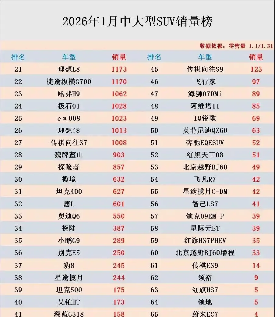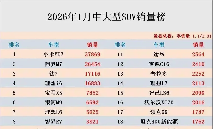 我昨天刷朋友圈,看到这组销量数据直接笑出声:2026年1月中大型SUV销量榜,前十名全被新能源霸屏,传统燃油车只剩宝马X5孤零零硬扛!你敢信?普拉多跌到第13,普拉多销量才2252辆,比小米YU7少卖了3万5!这哪是销量榜,分明是燃油车的“断头台”啊。