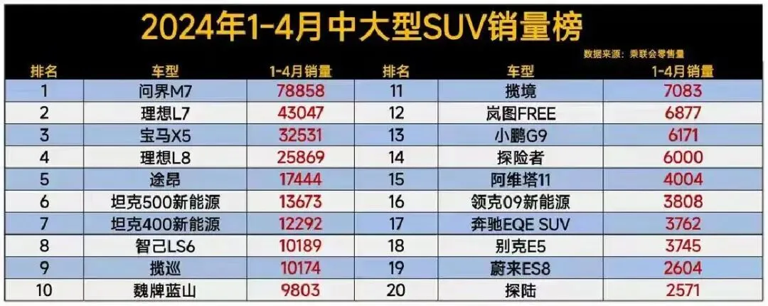 先说最扎心的:小米YU7一月狂卖37869辆,直接登顶第一。问界M7、钛7紧随其后,16883辆的销量,比隔壁宝马X5多出一倍多。宝马X5销量7852辆,勉强排第五,成了燃油车里唯一能说话的。红旗HS6混动3767辆挤进前十,普拉多2252辆掉到第13,领克09才1781辆,真·燃油车集体躺平。