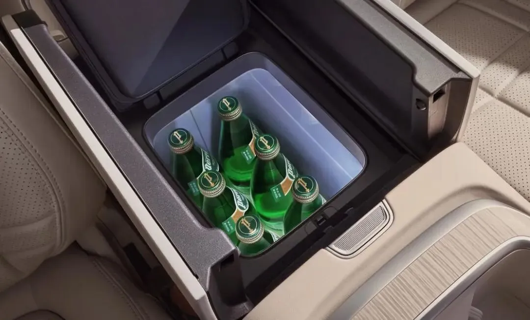 深蓝S09搭载了一体式智能可前后移动中岛,这个中岛是目前行业内少有的,它具备手机无线充电功能,还带有一台容积为10L的冷暖一体箱,内部温度可以在-6~50℃之间自由调节,冰箱容积不小,可轻松容纳8瓶550ml的矿泉水,支持调节的温度范围也较大,如此一来即便是大冬天出门,一家人也能在车内随时喝上热饮了,尤其是对于有婴儿宝宝的家庭来说,车上有一个支持加热保温的冰箱,确实很贴心温暖。而且这个中岛支持前后移动,同时能方便第二第三排乘客使用中岛功能。
