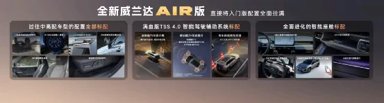 AIR版虽为入门版车型,但标配了L2级辅助驾驶的TSS 4.0主动安全系统;包含了驾驶员膝部气囊和前排中间气囊在内的7个安全气囊;以及驾驶席10向电动调节、14英寸中控触摸屏、64色氛围灯、50W无线充电、前后倒车雷达+倒车影像、后视镜电动折叠和加热等等。