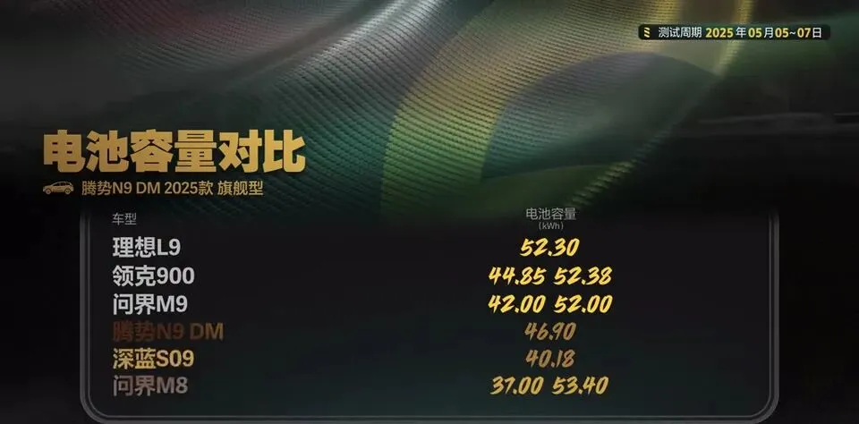 52.38kWh,问界M9 52.00kWh,腾势N9 DM