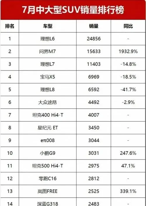 需要我帮你分析一下榜单中某款热门车型(如小米YU7或问界M7)的核心竞争力,或是整理一份适合家庭用户的同价位SUV选购建议吗?