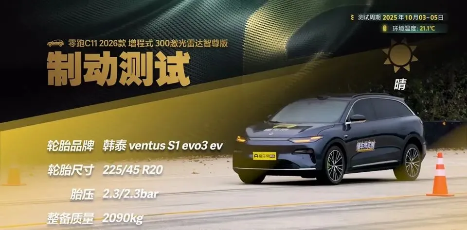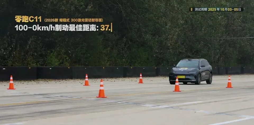 成绩:100-0km/h制动最佳距离37.74米。我个人必须说一句:这点必须给零跑C11大大的好评。2吨的SUV能刹到这个数字,不仅是安全感,也是底盘/轮胎匹配得当的表现。