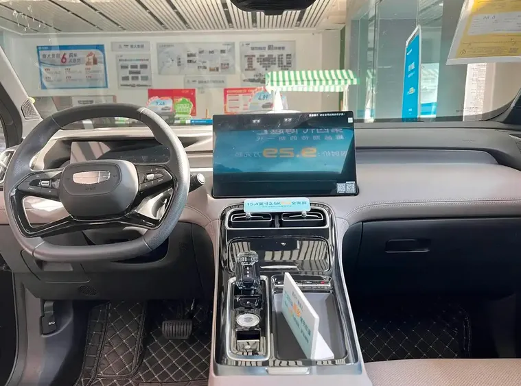 拉开车门,博越REV的内饰诠释了何为“简约而不简单”。极简环抱式对称布局让线条从门板自然延展至中控,大面积皮质包覆与菱形缝线工艺,搭配钢琴黑饰板和指尖涡流触感旋钮,豪华感扑面而来。