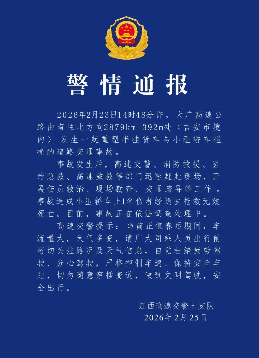 江西高速交警七支队2月25日发布警情通报: