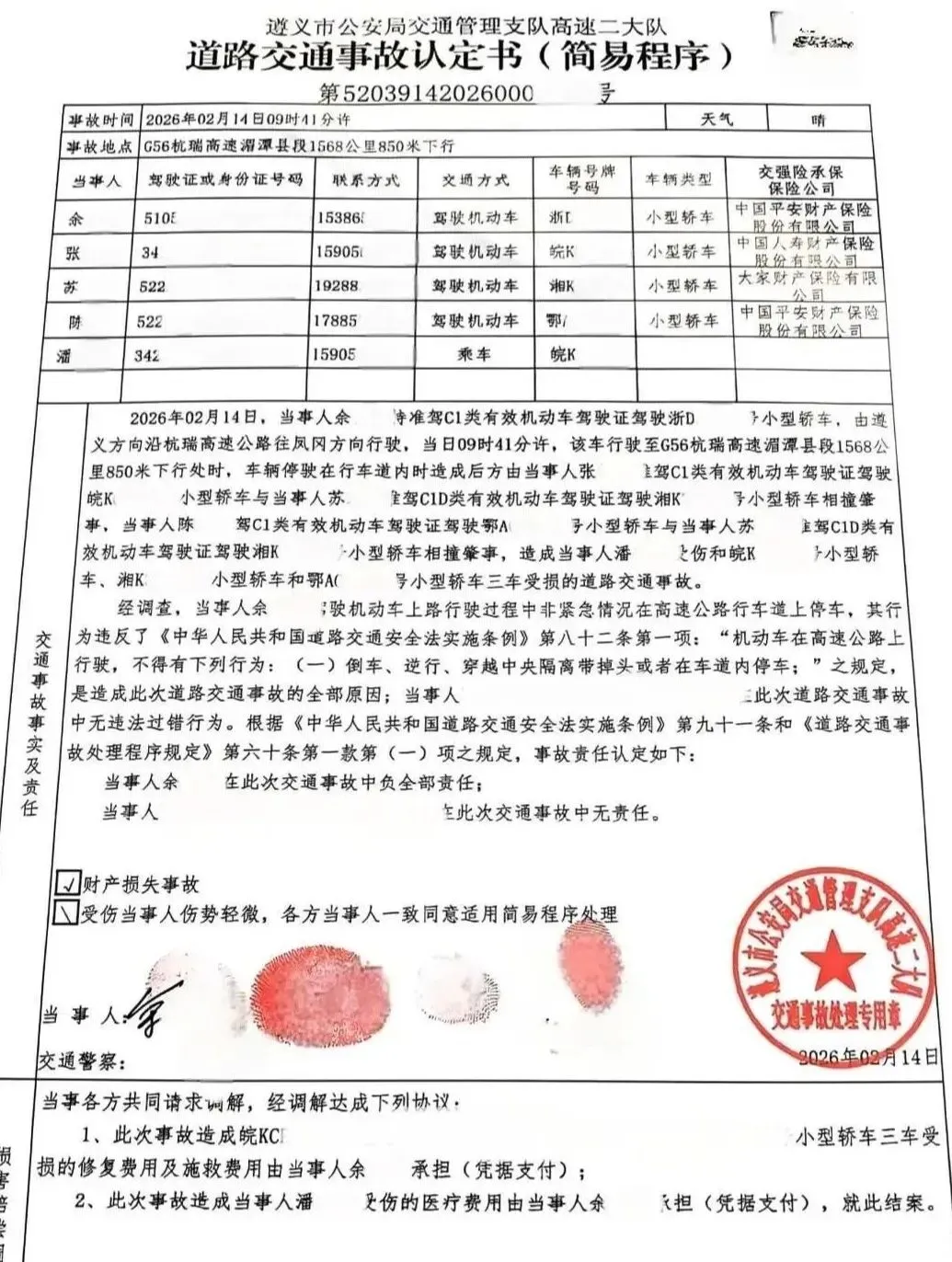 事故认定:根据调查,高速二大队依法对此次道路交通事故作出认定,余某因违反规定在行车道内停车,承担本次事故全部责任,并对其违法行为作出罚款100元驾驶证记9分的处罚。