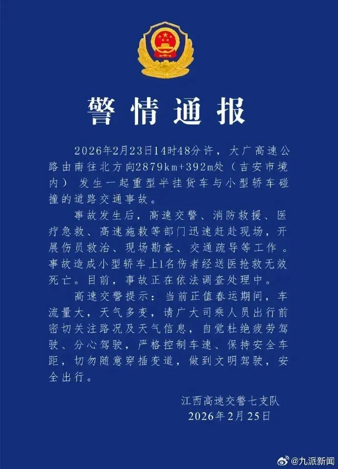 2月23日14时48分许,大广高速公路由南往北方向2879km+392m处(吉安市境内)发生一起重型半挂货车与小型轿车碰撞的道路交通事故。事故发生后,高速交警、消防救援、医疗急救、高速施救等部门迅速赶赴现场,开展伤员救治、现场勘查、交通疏导等工作。事故造成小型轿车上1名伤者经送医抢救无效死亡。目前,事故正在依法调查处理中。