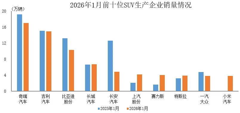 据中国汽车工业协会统计分析,2026年1月,销量排名前十位的SUV生产企业共销售73.4万辆,占SUV销售总量的63.9%。