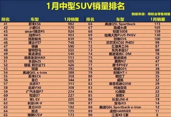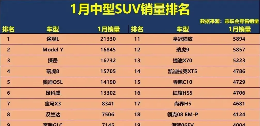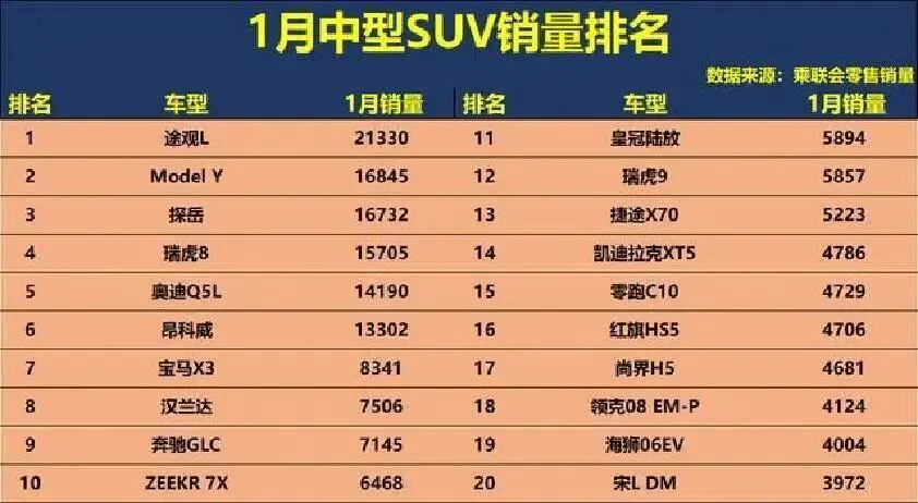 # 1月SUV榜炸了!Model Y惨遭“截胡”,中型车市场90%车型销量腰斩?