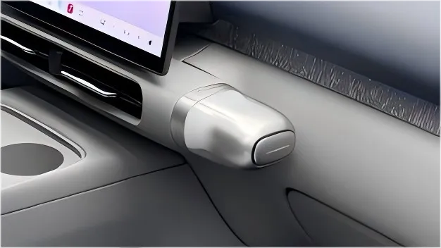 而在中控屏右下角位置,能看到一个突出的部件,官方称其为“IP Bar”带有氛围灯、香薰功能,它也可以从上面取下来,里面是一个拓展接口,官方也表示正在研发更多的拓展件。其实,这就跟零跑B10副驾位置的功能拓展区一样,属于巧思一类的设计。