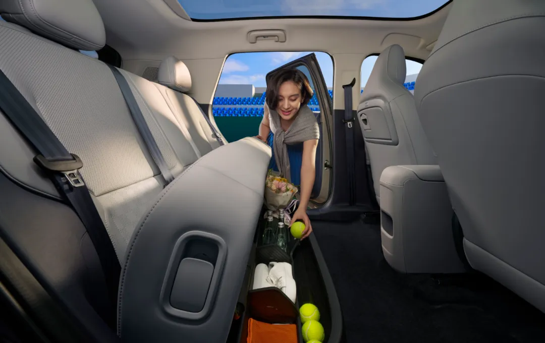 除了这一小桌板外,零跑A10的后排还有一大“彩蛋”就是——后排坐垫下还藏了储物空间(如下图所示)。将后排坐垫翻起来后,下面藏有一个约30升的储物空间,且中间用隔板做了间隔,可以放一些杂物,为后备箱减了压。