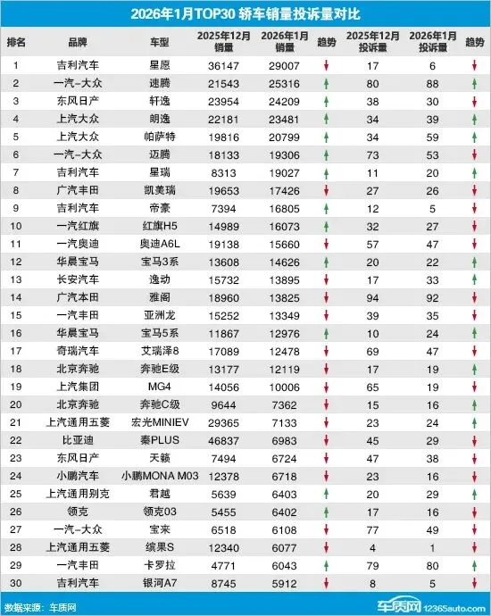 2026年1月国内轿车市场累计零售销量62.2万辆,环比下降36.5%,同比下降24.7%。同期,车质网受理车主针对轿车的有效投诉12,286宗,环比上涨4.3%,同比上涨99.3%。去除投诉人自愿申请撤诉的信息后,2026年1月TOP30轿车销量投诉量排名如下: