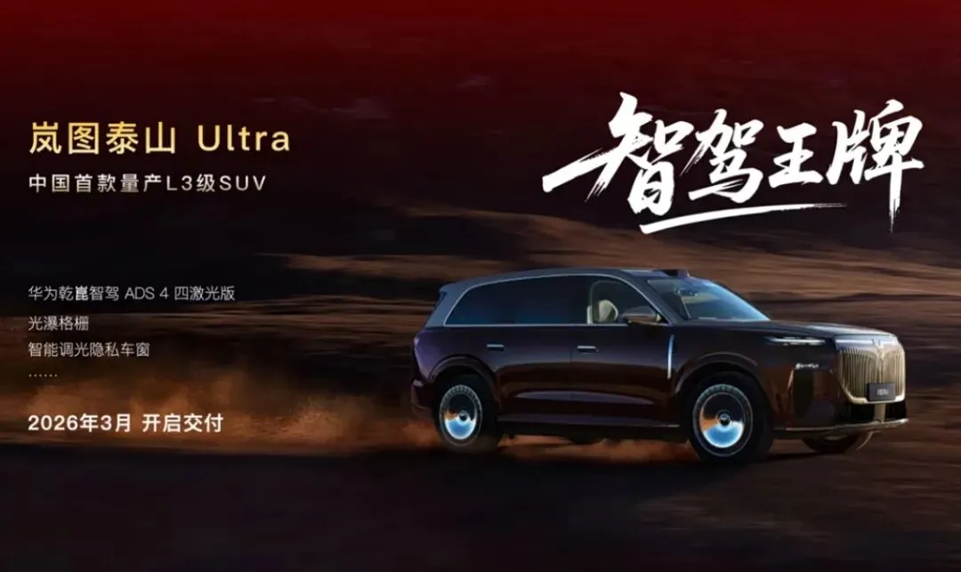 按照岚图汽车方面的规划,岚图泰山Ultra版也将于3月开启交付,新车将按照L3级自动驾驶架构设计,并搭载最新的华为乾崑智驾四激光方案。