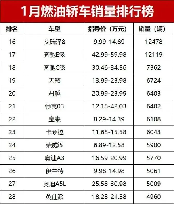 兄弟,刚看到1月销量数据,差点把手机砸了——燃油轿车卖了42万辆,新能源才2款破万。市场寒风呼啸,燃油车却稳如老狗,17款车月销过万,新能源连个影子都摸不着。为啥?这波操作太扎心了。