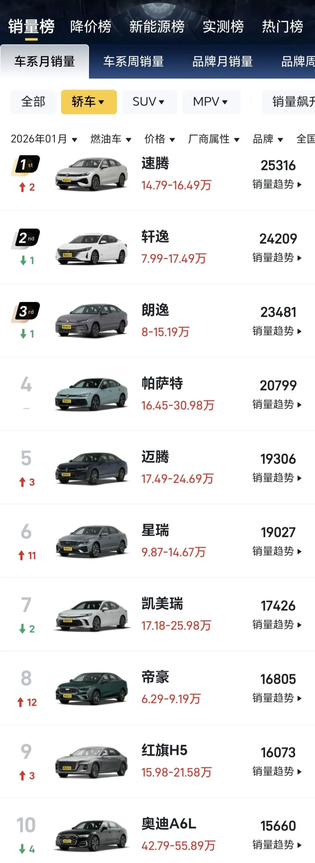 2026年1月燃油轿车销量榜单,很有意思。