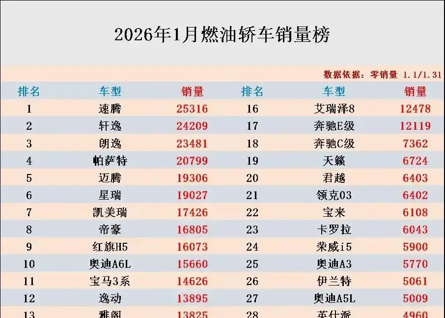 乘联会刚甩出1月燃油轿车成绩单,17款车月销过万。速腾、朗逸、迈腾、凯美瑞、奥迪A6L,这些老将稳如老狗,销量全在1.5万往上。速腾更是杀疯了,直接干到榜首——15660辆,比朗逸还多出几百。轩逸?连前5都没混上。