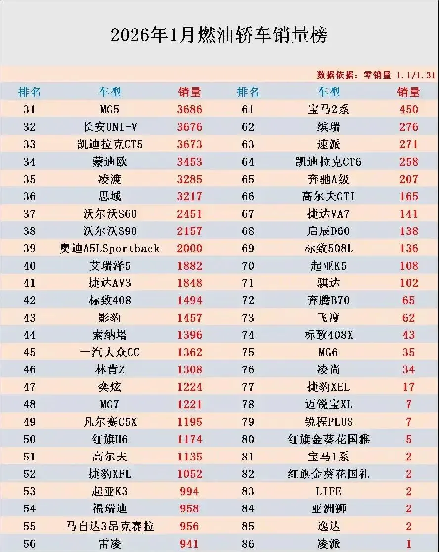 再看30名之后,惨得一批。长安UNIV、思域这些,销量才1000出头。福瑞迪销量958辆,排在第54;威朗503辆,第59;速派271辆,第63。迈锐宝XL、宝马1系,销量只有个位数,几乎垫底。网上有车主吐槽:“提车时被4S店忽悠说‘卡罗拉月销过万’,结果1月只卖6000多,我这车成了‘销量黑洞’。”
