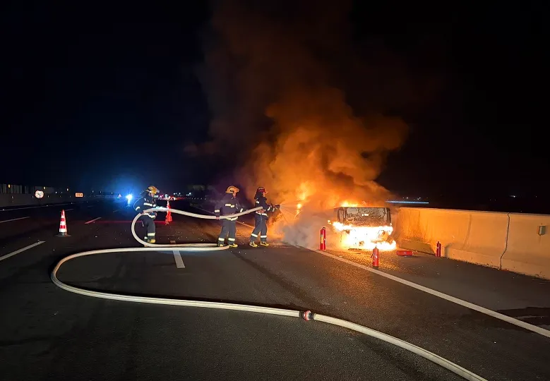 消防救援人员抵达后,经侦察确认现场无人员被困,立即对事故路段实施安全警戒,并出1支水枪对起火部位进行压制灭火。明火被扑灭后,救援人员持续对车体进行冷却,直至确认无复燃风险后才撤离。