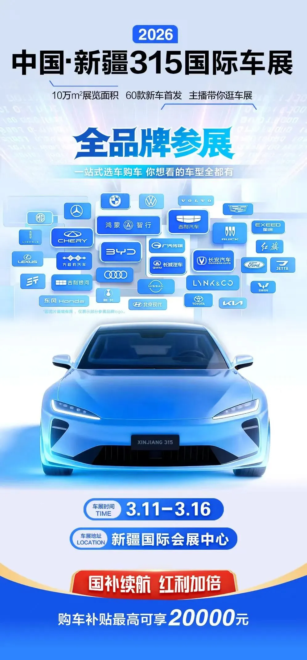 3月11日-3月16日,2026新疆315国际车展将在新疆国际会展中心盛大启幕。