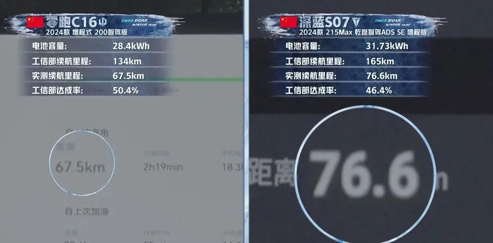 而深蓝S07和零跑C16在纯电这块,冬天就属于“别抱太大幻想”的类型——50%左右的达成率,意味着你对它的期待要打个对折。