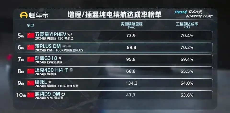从增程插混纯电续航达成率榜单来看,宋PLUS
