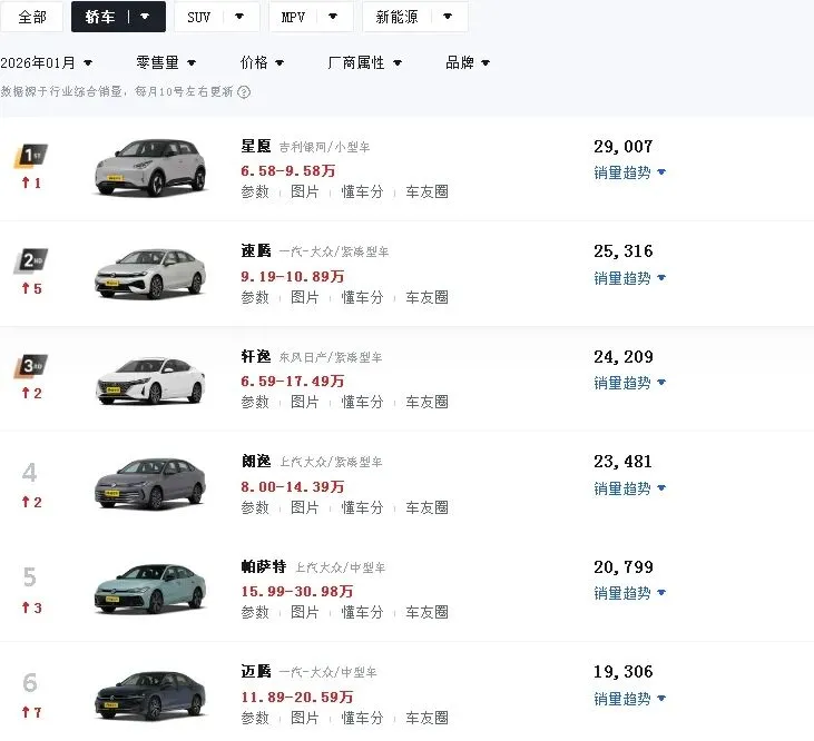 随着2026年新能源政策的改变,新能源车的销量也发生了不小的变化,尤其是在轿车领域。在2026年一月份轿车销量榜前十位中,只剩一台新能源车可以力帆狂澜,其他席位全部被燃油车占领。今天咱们就来盘一下1月份的轿车销量排行。