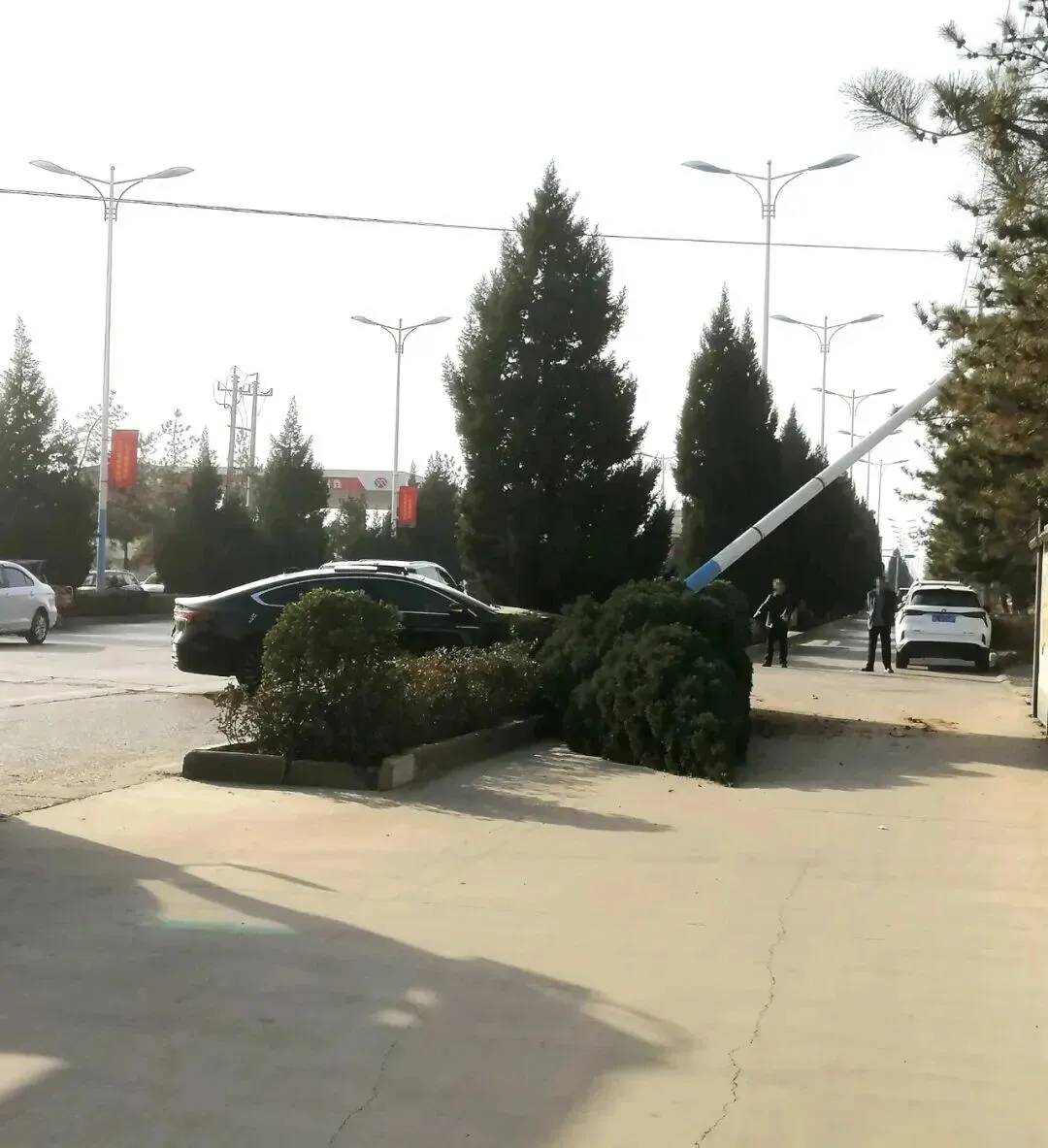 临汾:一黑色轿车冲入路侧绿化带,将路灯杆撞倒...