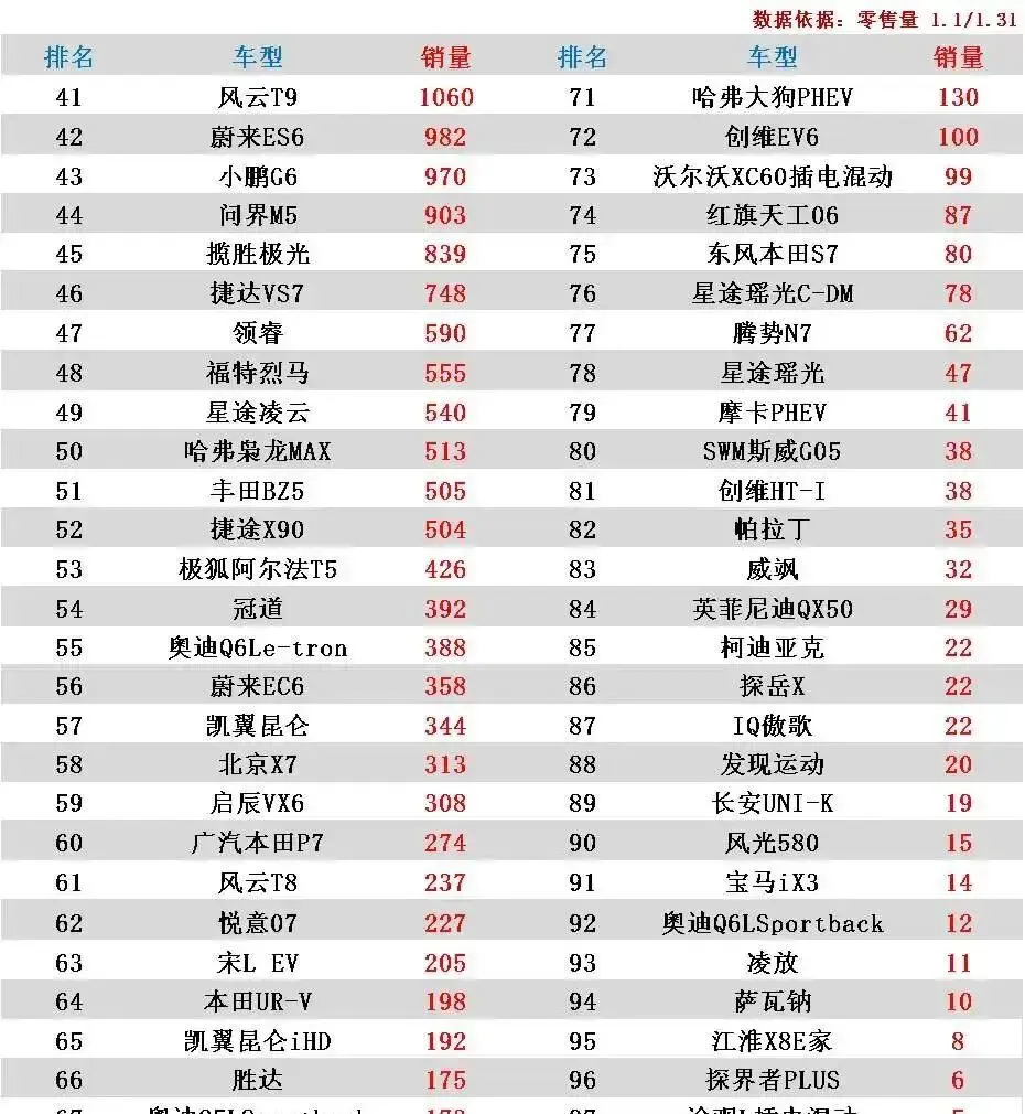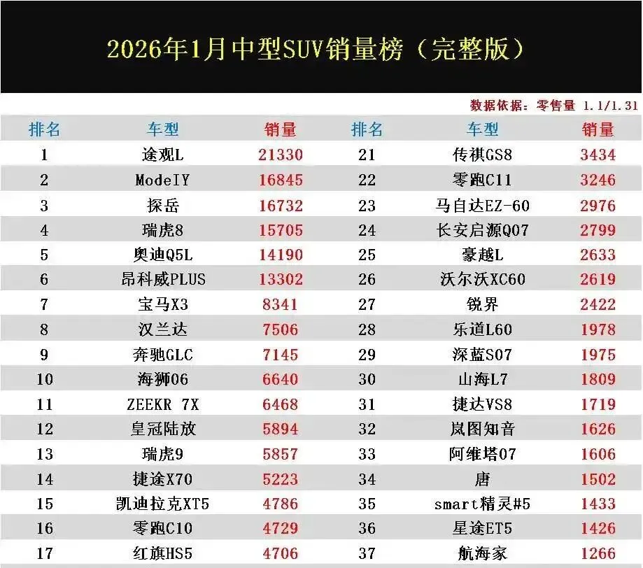 刚看到乘联会1月数据,我手里的咖啡直接洒了——燃油车这次真把新能源按在地上摩擦了!大众途观L单月狂卖21330辆,直接破纪录登顶;特斯拉Model Y暴跌5万,只剩16845辆;比亚迪宋L跌到第20名,连名字都快被忘了。老司机们集体回流,为什么?