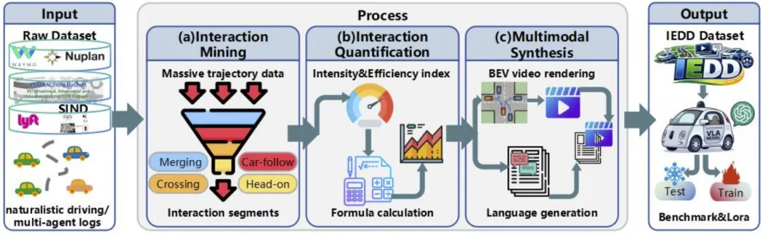 团队设计了一套可扩展的数据集生产流水线,整体流程如图1所示,包含交互挖掘、交互量化、多模态合成三大紧密耦合的核心模块,最终实现从原始轨迹数据到多模态IEDD数据集的转化,同时构建了IEDD-VQA视觉问答子集,完成视觉与语言的严格时空对齐。