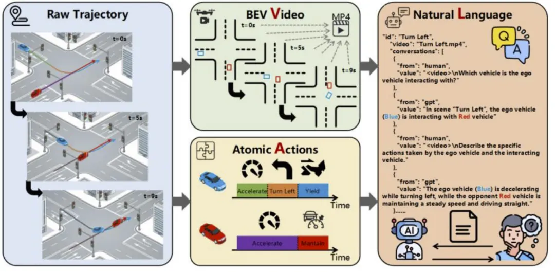 图4为轨迹驱动的多模态数据合成工作流,展示了从原始轨迹到原子动作,再到BEV视频和自然语言问答对的转化过程,同时给出了生成的JSON数据示例。
