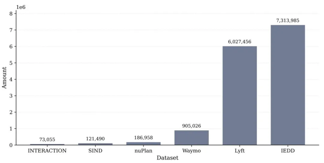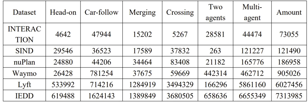 IEDD数据集包含基于轨迹的大规模交互片段数据集(IEDD)和VLA模型指令调优数据集(IEDD-VQA)两部分,核心统计特征如下: