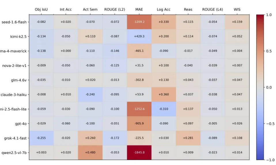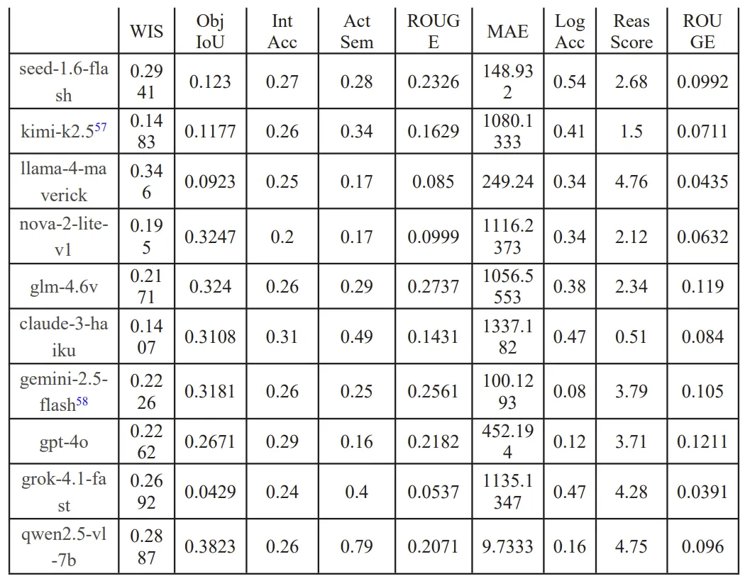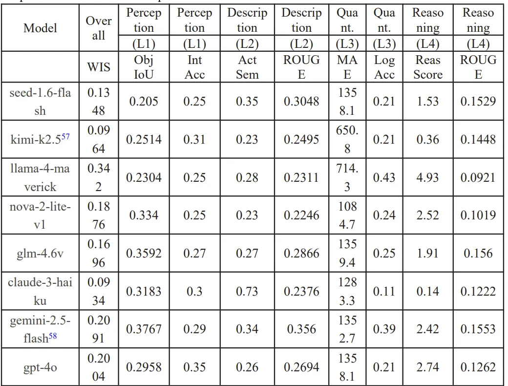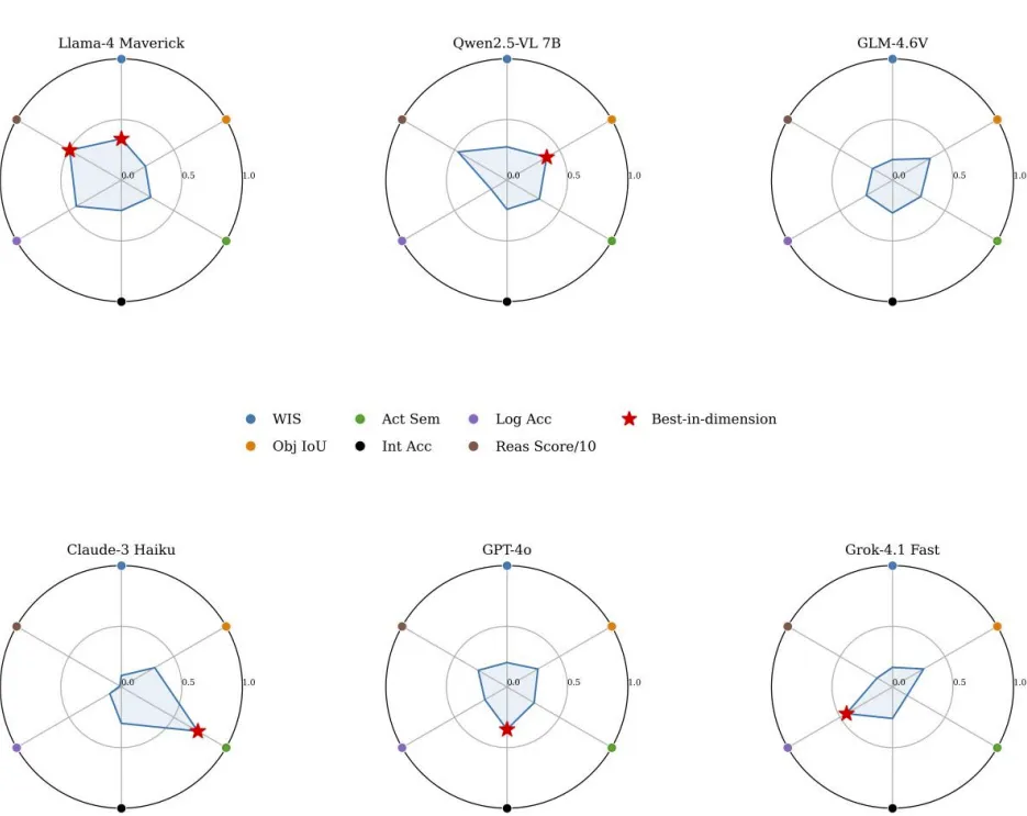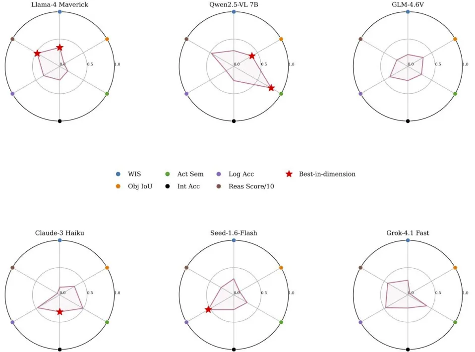 对十款主流VLM(含3款开源模型:Llama-4-Maverick、Qwen2.5-VL-7B、GLM-4.6V)进行零样本测评,结果如表4、图9所示:
