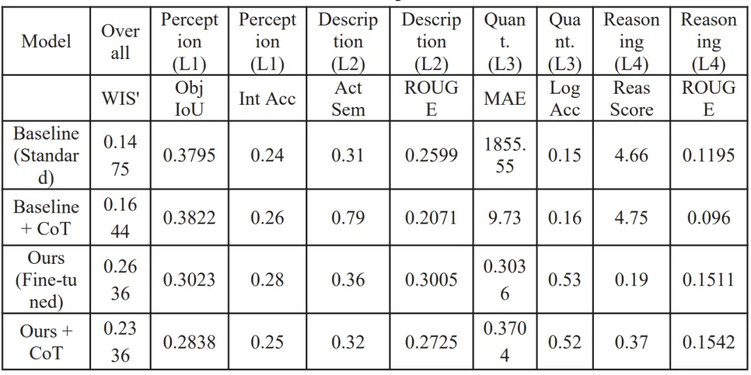 为验证IEDD数据集的有效性,团队建立了分层、多维度的评估框架,对十款主流VLM模型进行了零样本评估、CoT策略激活实验和域适配微调实验,全面检验模型在自动驾驶交互领域的感知、描述、量化、推理能力。