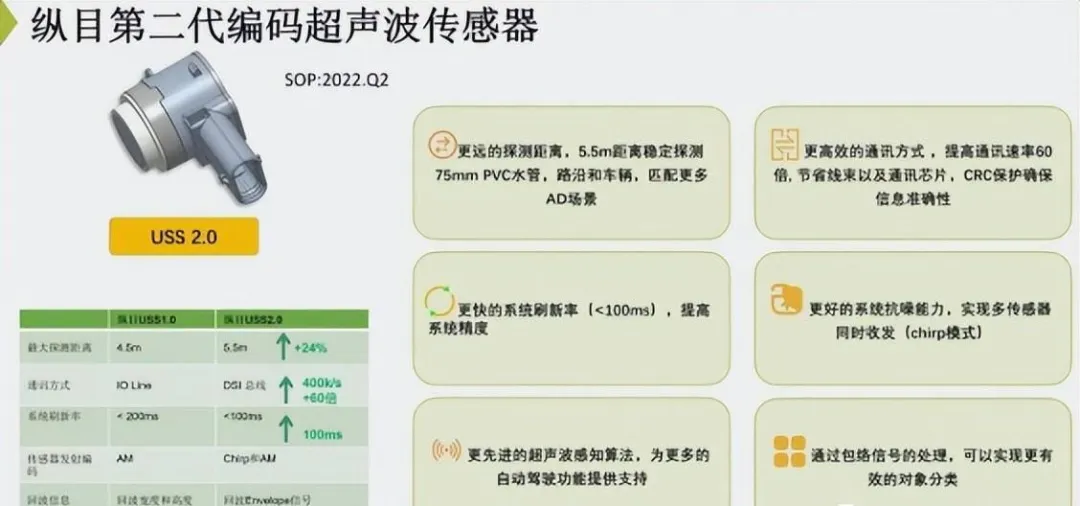 图7 AK2 USS采用的DSI总线架构从AK2布局情况来看,国外厂商布局早于国内企业。例如,博世于2016年成功研发出第六代超声波雷达,把数字信号和信号编码加在了一起,通过一个线性频率,使传感器可以做到多收多发。大陆集团基于CUS3超声波传感器(最远探测距离:5.5 m;具备自诊断能力)的全栈解决方案计划2024年量产。日本村田制作所的下一代产品可配合ElmosE 524.17驱动芯片支持变频(编码)使用,盲区仅15cm,最远探测距离达5.5m。